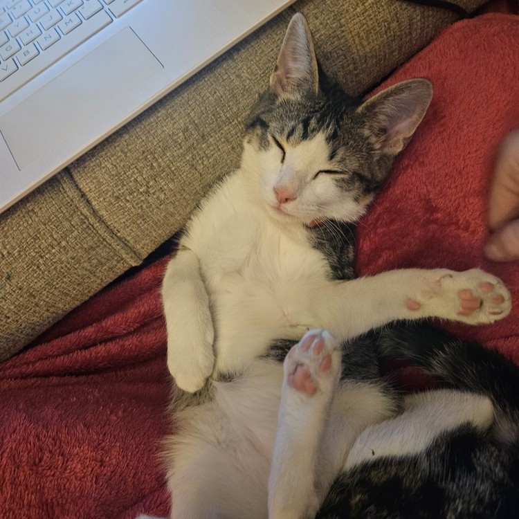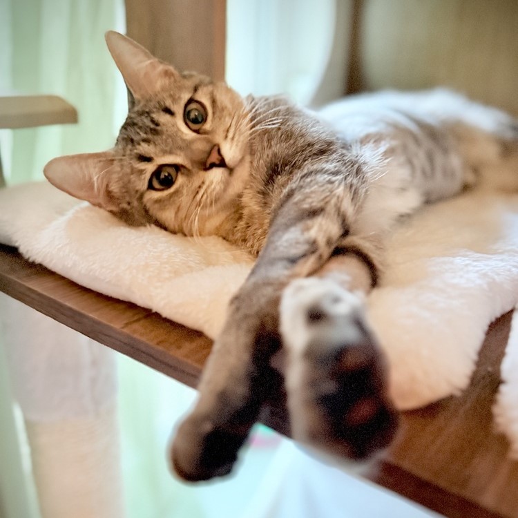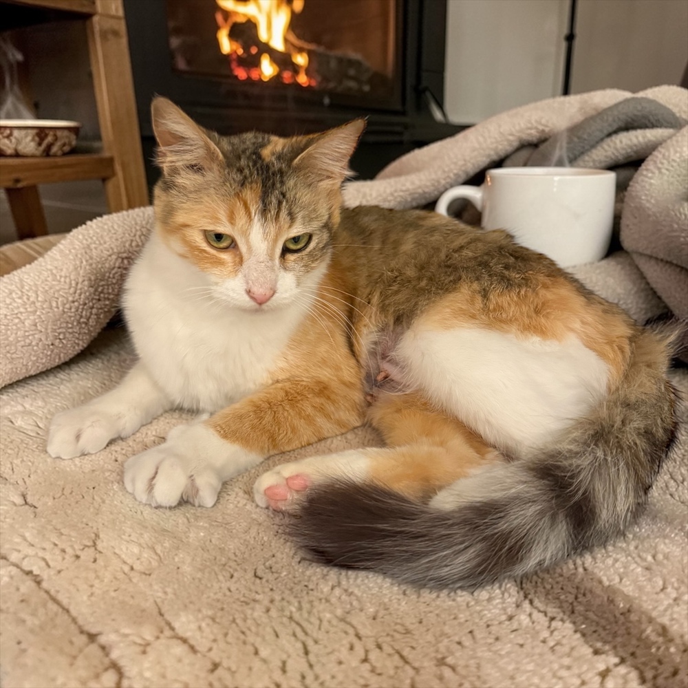 She’ll play for a few minutes, bat a toy around, maybe do a small zoom, and then she’s ready to curl up again. She loves a soft blanket, a warm lap, or anywhere she can stretch out and fully relax.