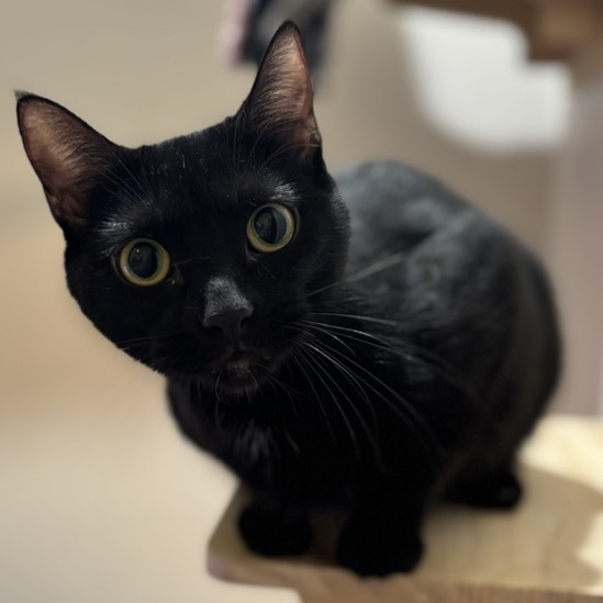 Chocks is a calm, steady little black cat with a more reserved personality.