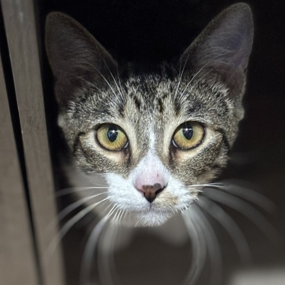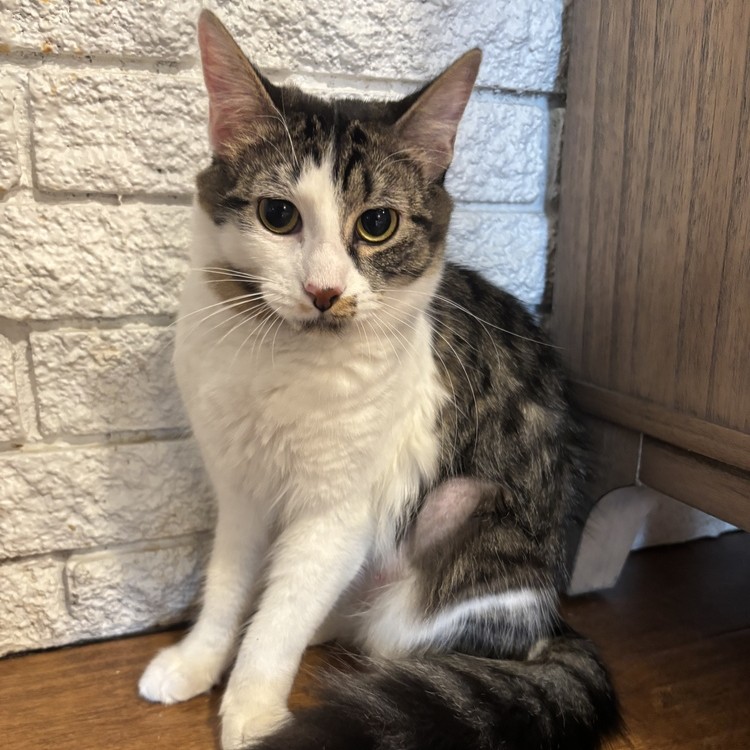 This gentle girl is a soft little cloud of tabby and white fluff, quiet but full of love. She’s happiest curled up in a sunny spot or softly purring on your lap. Low-key, sweet, and endlessly snuggly—she’s the perfect friend for someone who loves calm company and warm cuddles. Give her a home, and she’ll give you all the quiet love you didn’t know you needed.