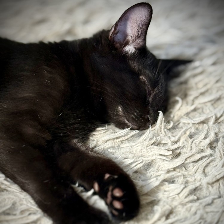 She’s easygoing and settles quickly in new spaces. Pick her up and she melts into you. Sit down and she’ll usually find her way over. She has a gentle, sleepy kind of vibe that makes her really comforting to have around.
