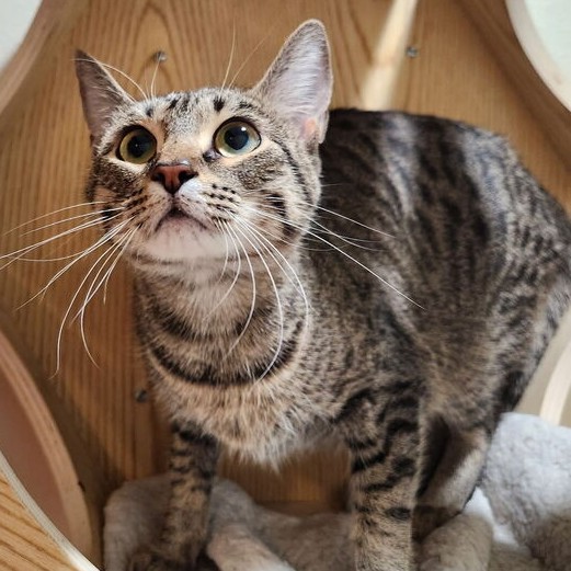 Once a shy little country girl with a healing wound, Finleigh has transformed into a stunning gray tabby with eyes full of soul. She’s got a little “resting art face” at first glance, but don’t be fooled — this girl is all heart. Finleigh is affectionate, playful, and deeply loyal once she trusts you. She loves to use her “hands” when she plays, occasionally dips her paws in bath water, and is perfectly happy to snuggle in your arms for hugs and kisses. She’s wonderful with other cats and reads the room like a pro. Finleigh may have had a rough start, but she’s living proof that the best art takes time — and love.
