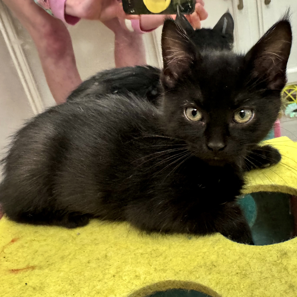 Theodore is a handsome little black kitten. This sweet boy carries himself with a charming calmness that makes him feel wise beyond his tiny paws. While other kittens may tumble and zoom, Theodore prefers a gentler pace — content to observe the fun before quietly joining in with a soft pounce and the cutest little hop.